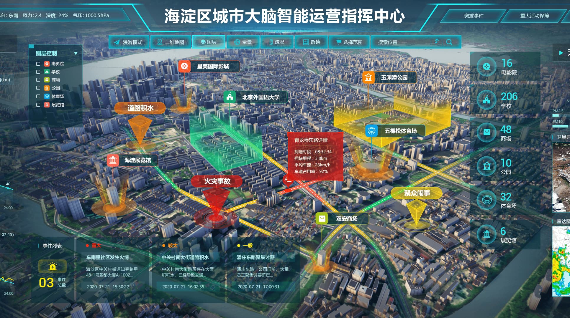 51WORLD built Haidian Brain after integrating enormous amount of data from the government, IoT, Internet and social resources, presenting on one picture the information of over 12,000 cameras, more than 10,000 sensors, 249 thematic maps, and about 170,000 buildings. It can intelligently analyze and process a variety of data at present.